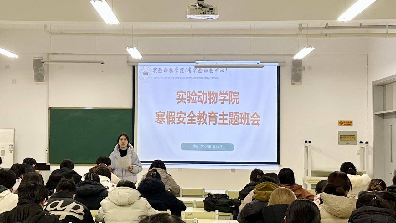 为进一步做实做细学生教育管理服务工作,筑牢校园安全与假期防护底线,确保同学们度过一个平安、祥和、充实的寒假。1 月 14 日下午,实验动物学院于学院楼 110 教室开展寒假安全教育主题班会。本次班会由辅导员陈云鑫主持,全体学生参与。