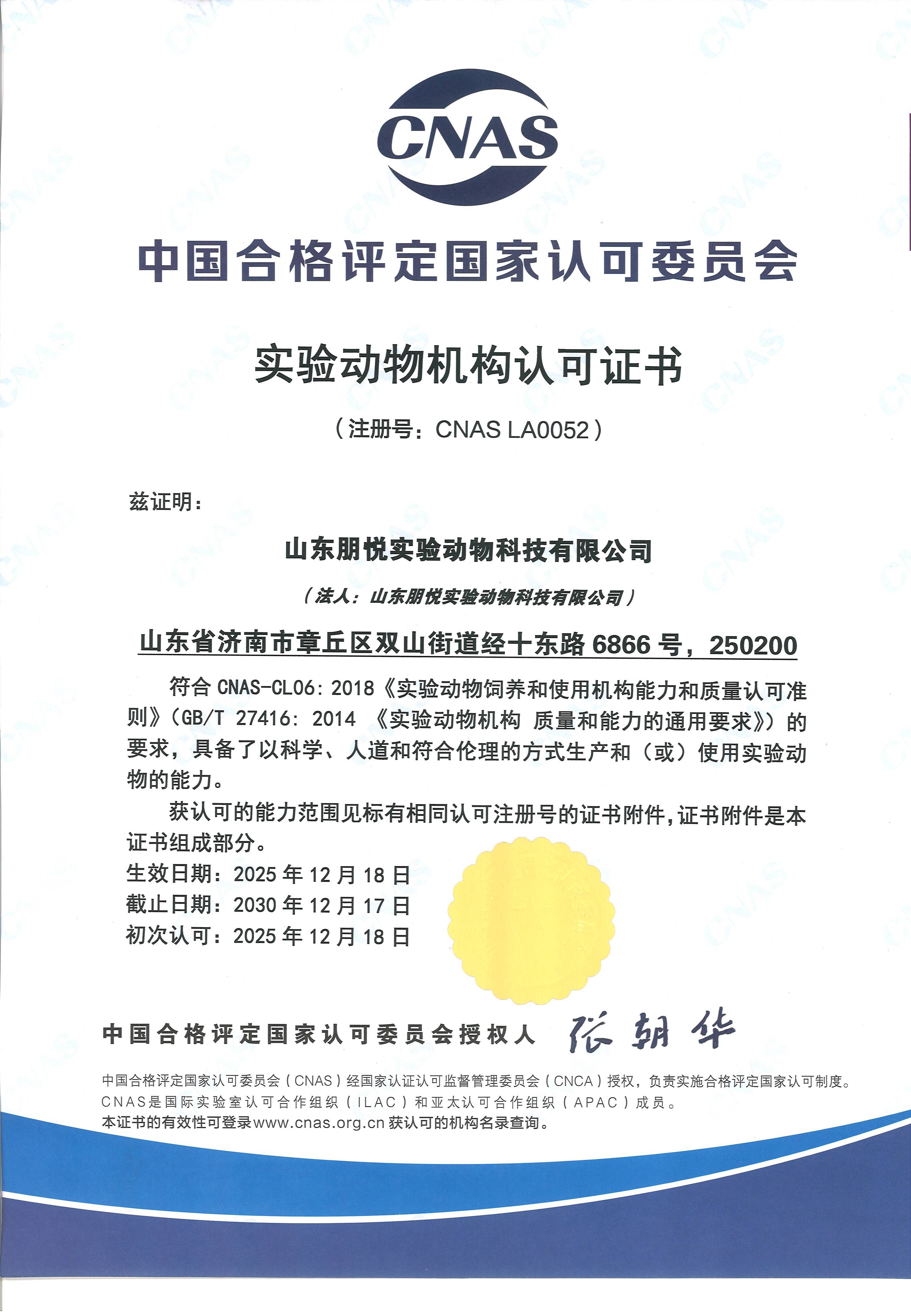 作为学院(中心)全资企业,山东朋悦实验动物科技有限公司于2025年12月18日率先斩获CNAS实验动物机构认可证书(证书编号:CNAS LA0052),成为山东省首家获此资质的大小鼠生产企业。公司深耕行业十余载,构建了完善的质量管理体系,现已成为山东省规模最大的SPF级大、小鼠繁育基地,年产200万只,服务辐射全国十余省市区。此次认证确立了公司生产质量的“国家级”公信力与国际互认性,为生物医药研发提供了坚实资源支撑,更为行业树立了规范化生产的质量标杆。